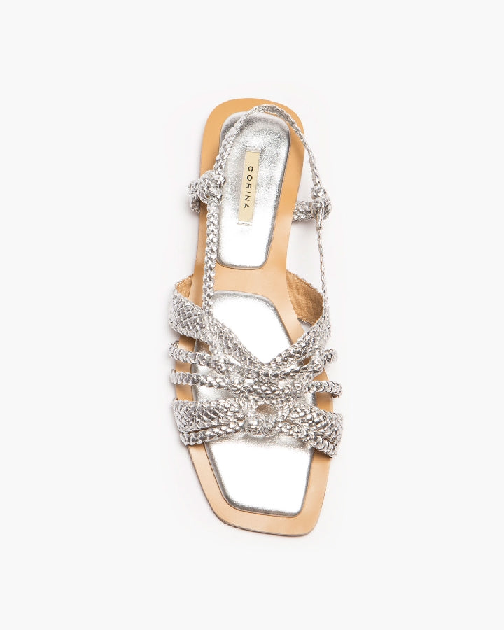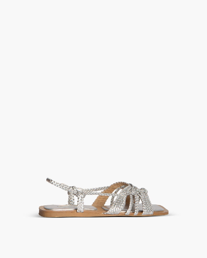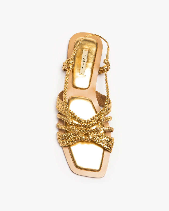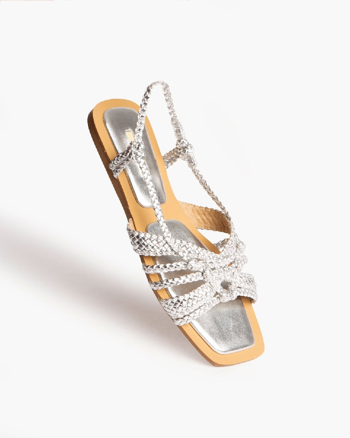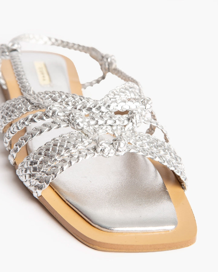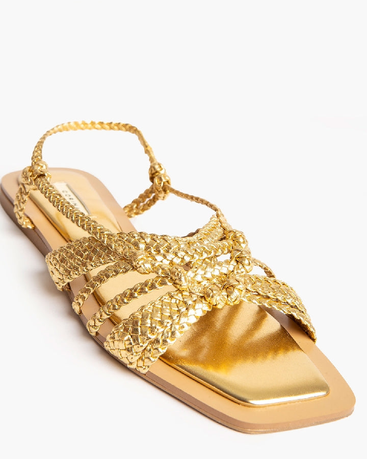 The "Cristina" flat sandal is a dazzling display of intricate craftsmanship and modern style. This stunning shoe features multiple thin, metallic straps—woven or braided into an eye-catching design—that gracefully adorn the foot. It boasts a contemporary square toe and a very flat sole for comfortable wear. Available in radiant gold and sleek silver, the "Cristina" adds a touch of glamour to any ensemble. Perfect for Miami evenings or adding a sophisticated sparkle to your daytime look in Coral Gables, this Spanish-inspired sandal is a true statement piece.