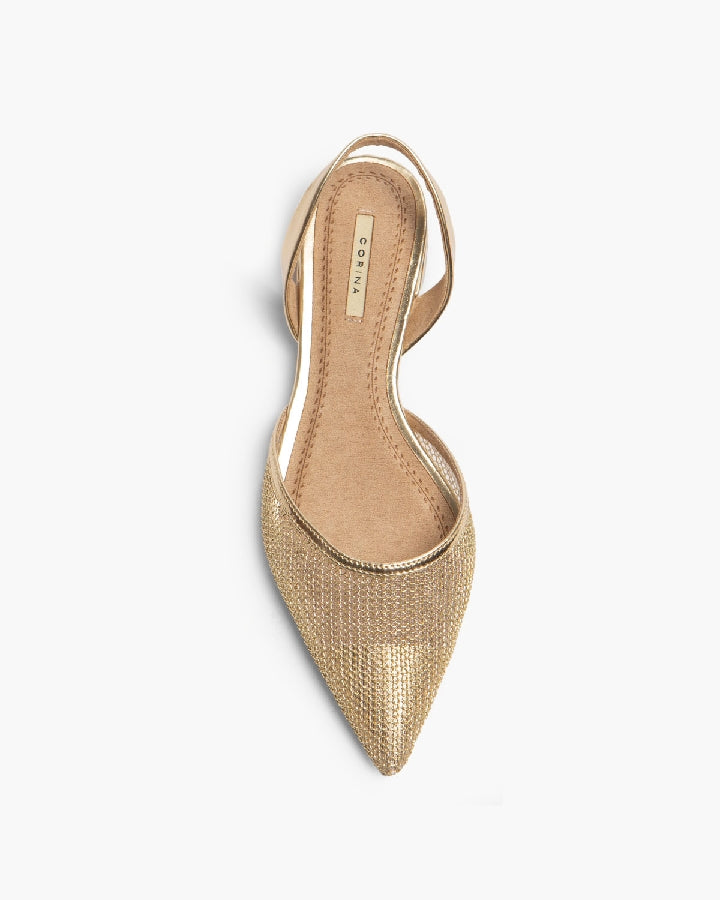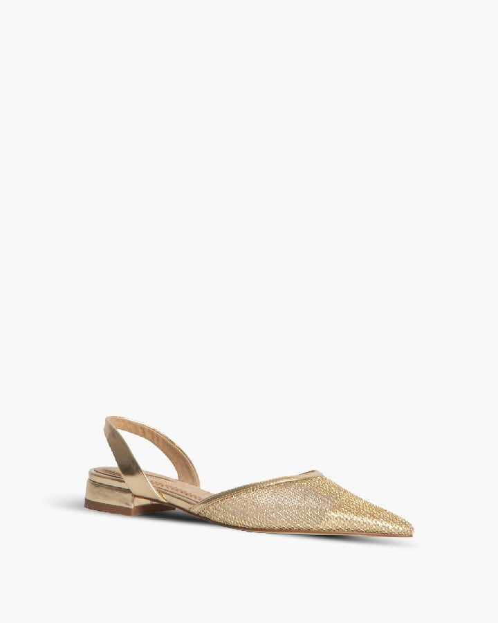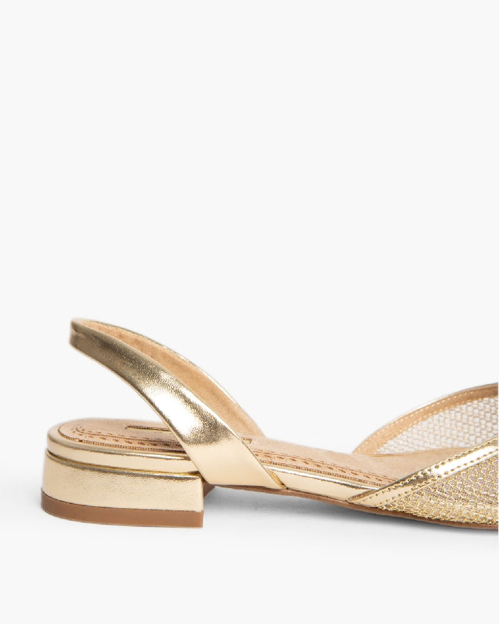 Add a touch of subtle glamour to your ensemble with the "Jimena" flat slingback sandal. This elegant shoe features a sophisticated pointed toe crafted from a shimmering metallic mesh upper, available in beautiful gold/champagne and silver tones. A slim heel strap, likely with a buckle, ensures a secure and comfortable fit. With a very slight 2cm heel, the "Jimena" offers a hint of lift while maintaining all-day wearability. It's the perfect choice for Miami events where you want a touch of sparkle, from evening dinners in Brickell to special occasions in Coral Gables, blending Spanish-inspired design with modern metallic flair.